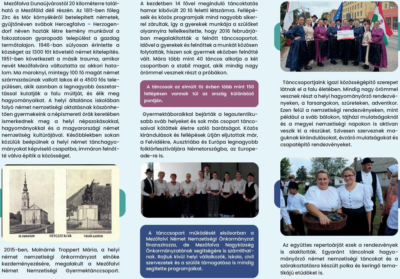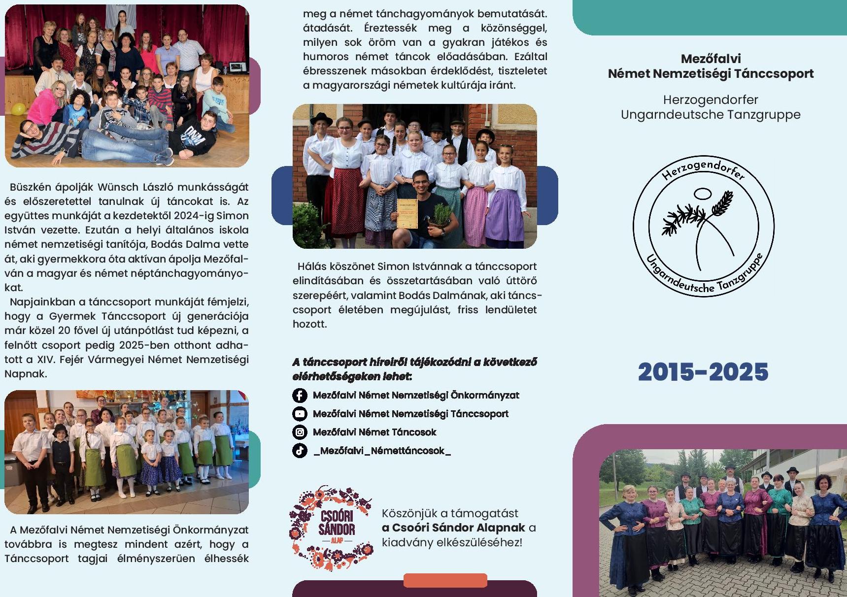 "A Csoóri Sándor Alap által 2024-ben meghirdetett és 2025-re elnyerhető pályázatán, a "CSSP-NEPTANC-MO-2024-0462" pályázaton 400.000,- forintot nyertünk a Német Nemzetiségi Tánccsoport 10 éves jubileumának megrendezésére. Ebből az összegből vásároltunk egy hordozható akkumulátoros hangszórót, kiadványt készíttettünk a tánccsoport elmúlt 10 évéről, viseletet varrattunk a gyermek tánccsoport részére, valamint a gálaműsor zenekari kísérete is ebből valósul meg."